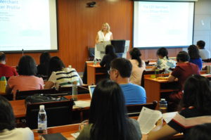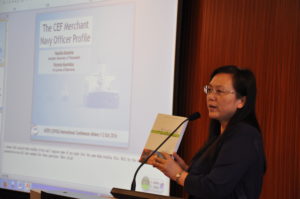 Kazamia博士分享了她采用行动导向法,以欧洲语言共同框架职业形象项目为指导,进行ESP需求分析的思路和方法。讲座以海军商船军官、语言教师、海军军校学生为例,分析职业背景信息、专业信息、情境信息、最常见情境、最挑战情境以及跨文化交际失败情境等六大项内容,进行具体的需求分析,从而为专门用途英语课程设计提供参考。讲座后,Kazamia博士与在座教师进行了热烈问答,就研究体验、如何将研究成果应用于课堂活动设计和教学资料准备、如何将典型实例扩展到其他语境、课程大纲应以情景还是应以技能为主线、如何在国际刊物发表文章等问题进行了深入探讨。