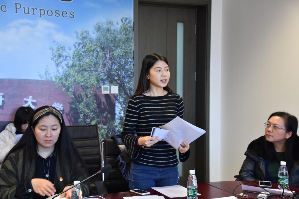 吴越的入党介绍人李莉文和仵胜奇首先向大家介绍了吴越的政治思想、专业学习以及社会服务等情况。接着,吴越宣读了入党志愿书。吴越是新葡的京官网2018级MTI班长,曾在2018年9月至2019年7月担任新葡的京官网2018级少数民族预科班辅导员。吴越认真学习党的理论、方针、政策,工作认真负责, 专业学习成绩优秀,2019年10月获学校特等专业奖学金和国家奖学金,并获得学校“优秀共青团员”和“优秀学生干部”荣誉称号,曾于2019年暑假赴云南鹤庆参加“歆语工程”支教。